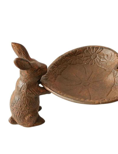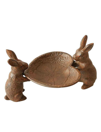 Cette mangeoire en fonte est un véritable objet décoratif ! Son design met en scène deux lapins attendrissants soutenant un plateau en forme de cœur, subtilement décoré de motifs floraux gravés.