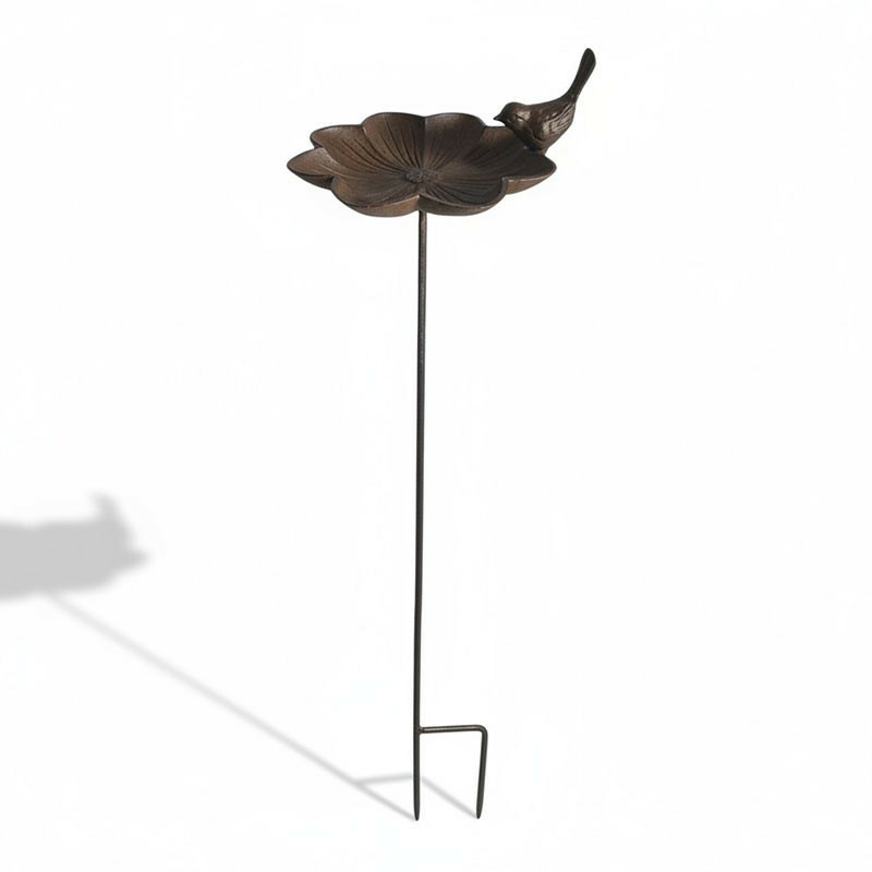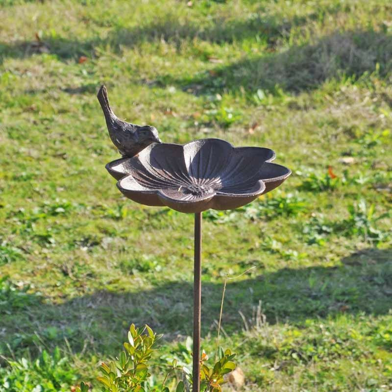 Parmi ses points forts, on compte son matériau durable en fonte qui assure longévité et patine élégante, un design raffiné en forme de fleur agrémenté d'un oiseau décoratif, une installation d'une grande facilité grâce à sa tige à planter, et la polyvalence d'être à la fois fonctionnelle et hautement décorative.
