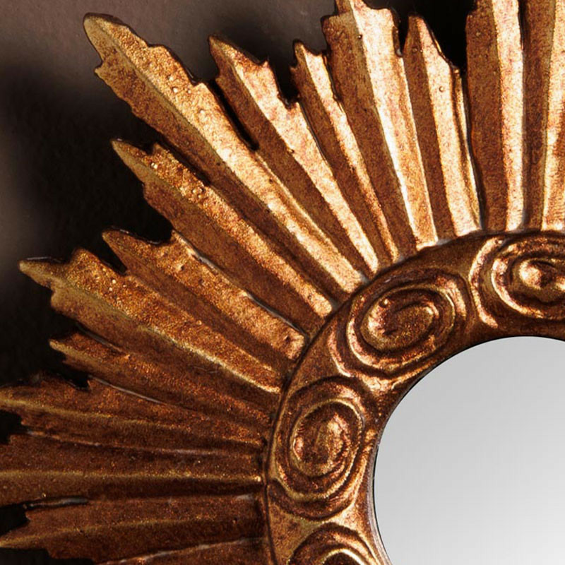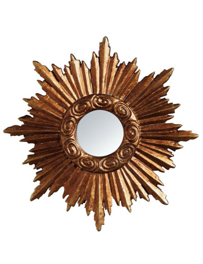 Inspiré des miroirs de sorcière et des designs "soleil" classiques, il se distingue par son cadre en résine aux détails méticuleux : des rayons sculptés en relief et une bordure intérieure ornée de motifs à volutes qui lui confèrent un aspect artisanal authentique. Sa patine dorée, à la fois riche et chaleureuse, capte la lumière pour dynamiser instantanément votre intérieur.