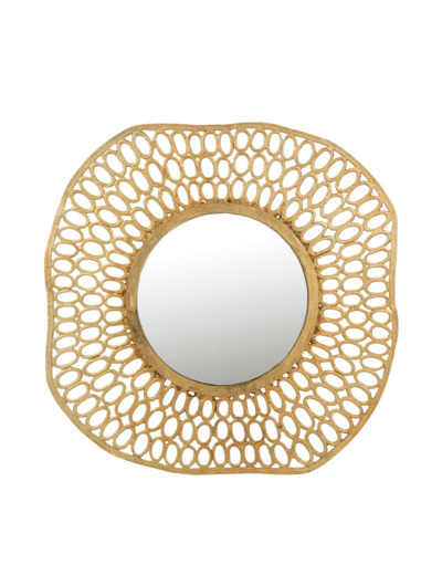Le contour du miroir est la véritable star de la pièce, fabriqué en aluminium de couleur or. Il est orné de mini cercles qui forment une magnifique bordure. Chacun de ces petits cercles est méticuleusement travaillé, créant un motif géométrique unique et captivant. La couleur or apporte une touche de chaleur et de glamour à l'ensemble, faisant de ce miroir un point focal dans n'importe quelle pièce.