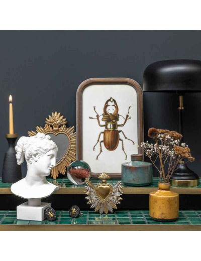 Pour une ambiance plus intime, vous pouvez l'intégrer à un mur de cadres et d'objets éclectiques pour briser les lignes droites et apporter une touche de fantaisie divine à la composition.