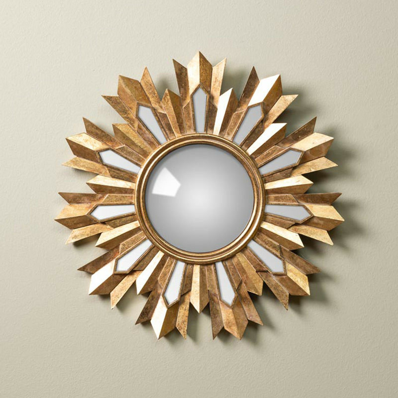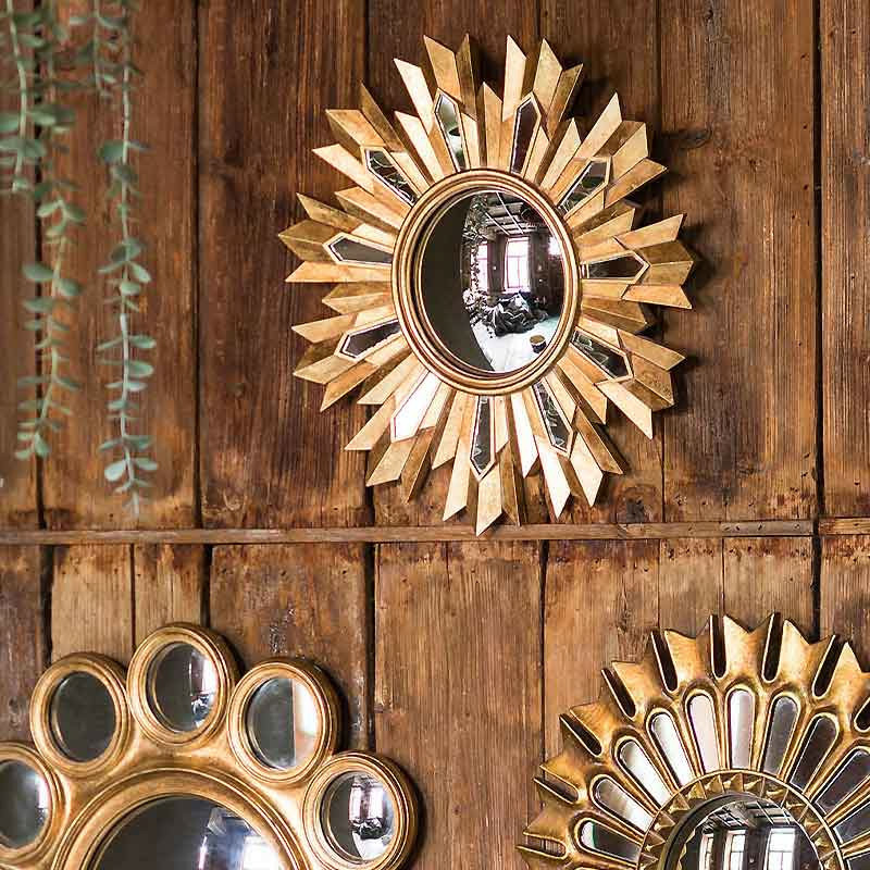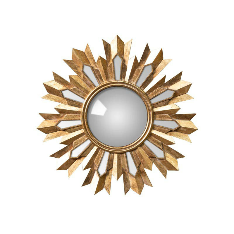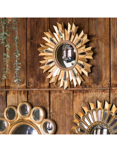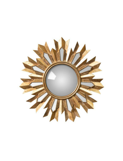 Miroir convexe résine doré flamme – Ce magnifique miroir décoratif trouve idéalement sa place dans une entrée élégante, où son design solaire et son effet bombé captivant apportent une première impression majestueuse et lumineuse.