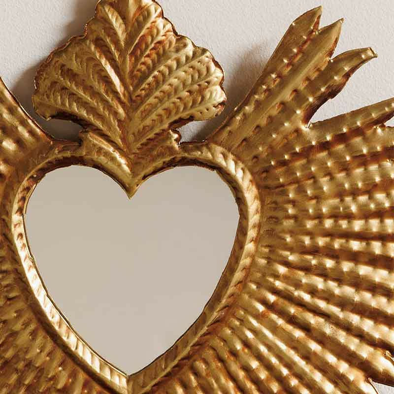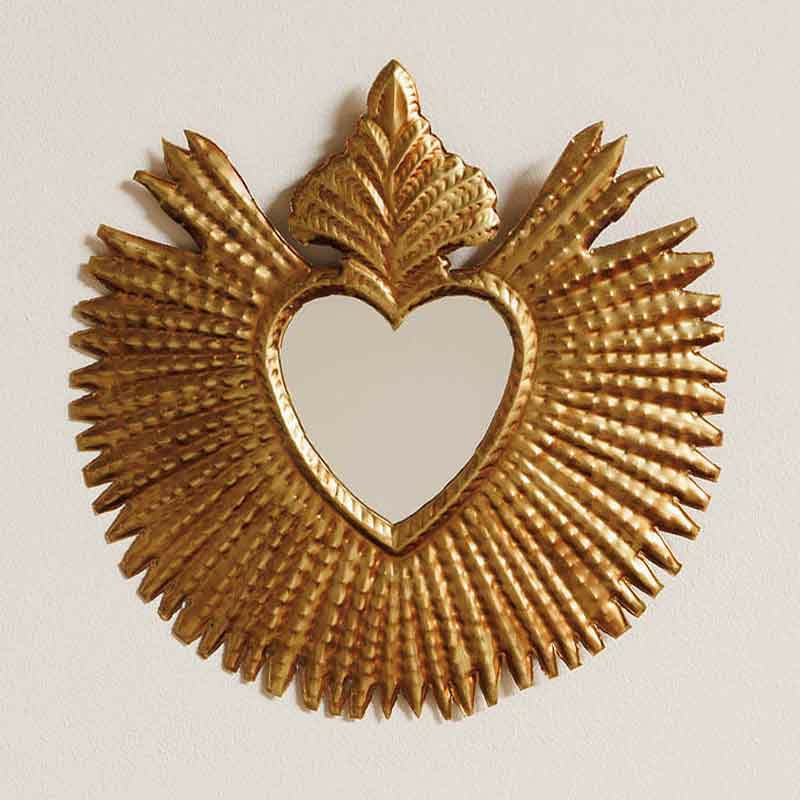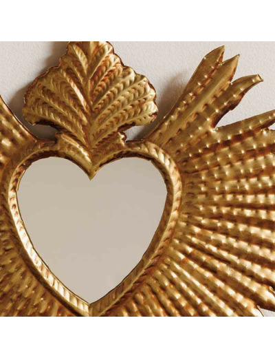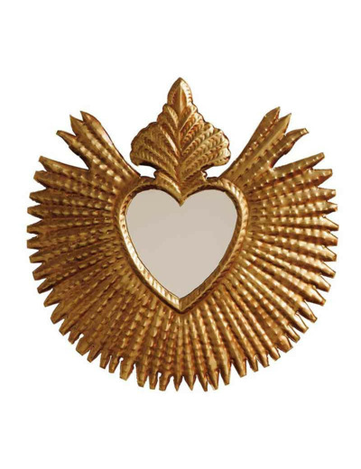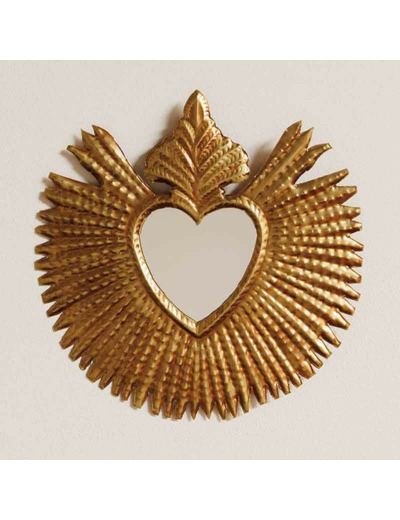 Ce miroir Ex-voto flamme dorée de 21 cm est bien plus qu’un simple accessoire décoratif. Inspiré des ex-voto traditionnels, il reprend la forme emblématique du cœur sacré, entouré de flammes stylisées finement sculptées.