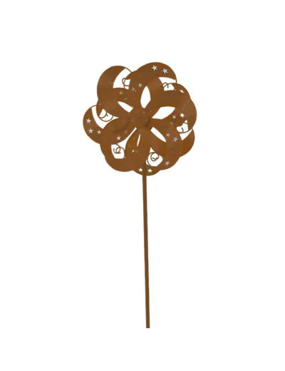 Un moulin fleur tournante coloré en fer, parfait pour apporter une touche de magie à vos espaces extérieurs. Son design unique de moulin à vent avec des formes de fleurs et d'étoiles s'anime au gré du vent. Facile à installer grâce à ses deux piquets robustes, sa couleur marron rouille lui donne un charme authentique.