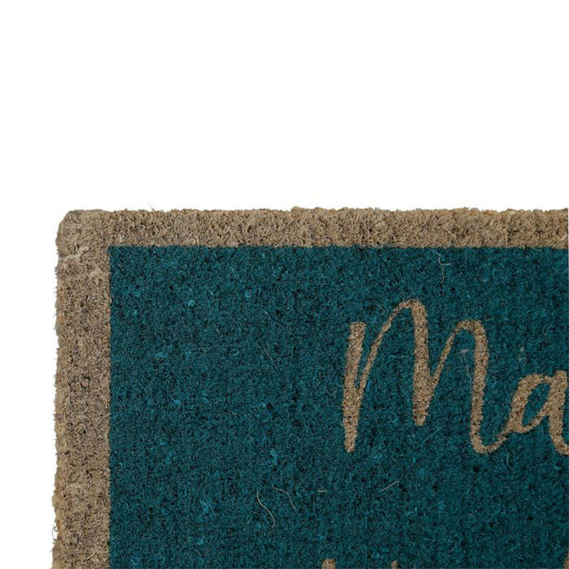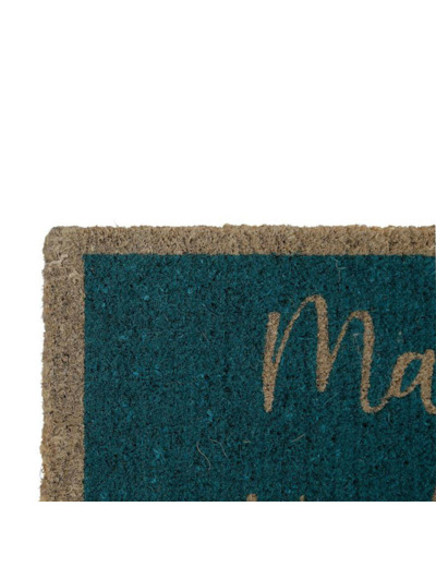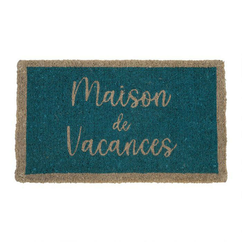 Devant une porte d’entrée, ce paillasson bleu en coco apporte une note décorative originale et tendance, renforçant l’esprit vacances et détente.