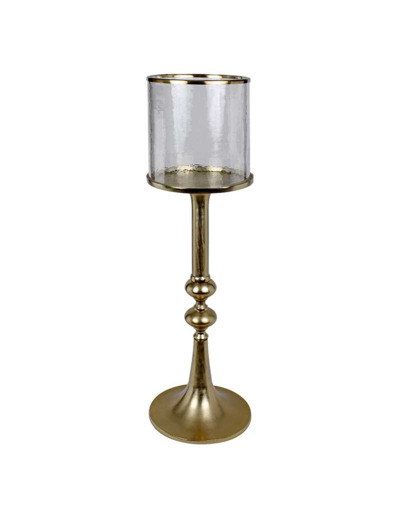 Ajoutez une touche de romantisme à votre décoration avec ce photophore qui illumine votre espace. Son design sophistiqué, associé à sa base dorée et à sa coupe en verre, en fait un accessoire parfait pour égayer n'importe quelle pièce.