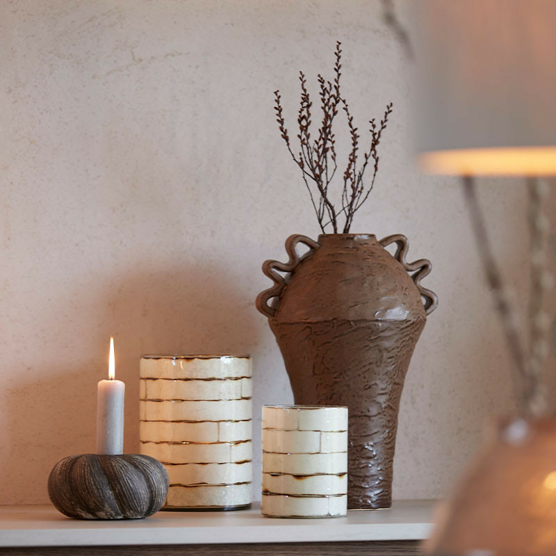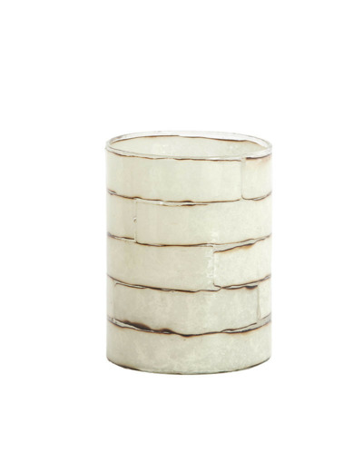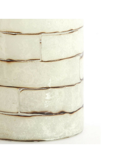 Fabriqué sur une base en verre transparent, le motif est réalisé avec un émail ou une finition texturée de couleur crème. Les petites imperfections volontaires des lignes sombres imitent l'aspect du vieux mur ou de la terre cuite blanchie.