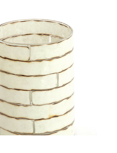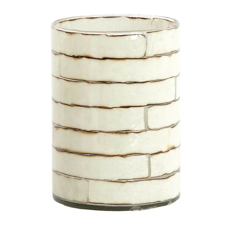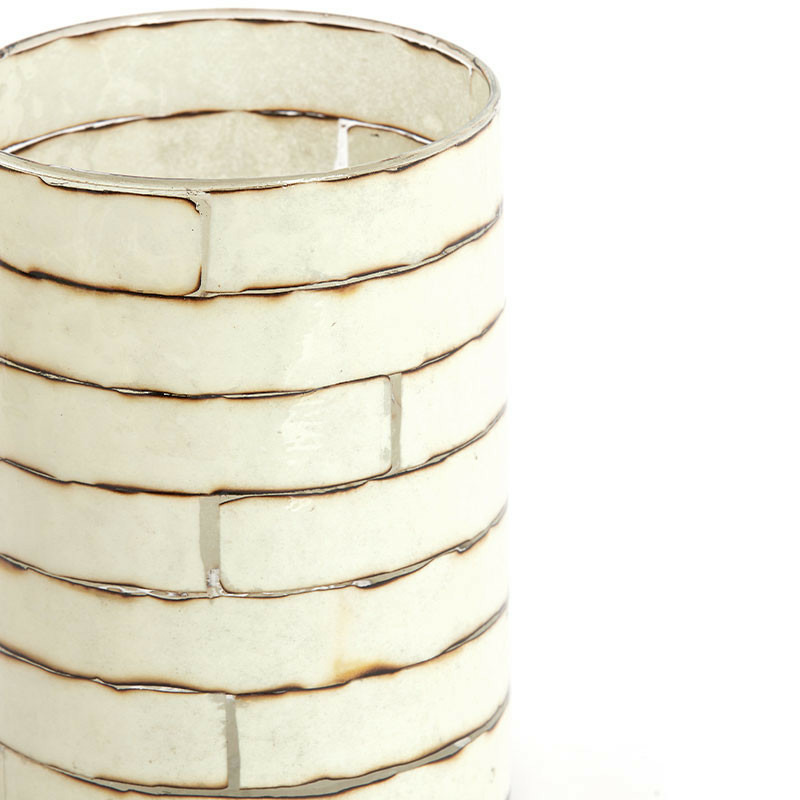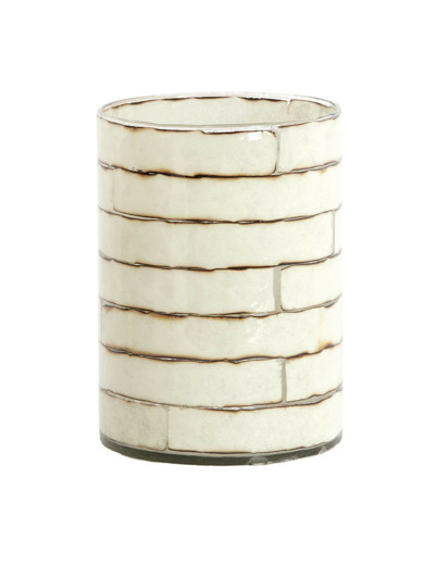 Le corps du photophore est un cylindre de verre transparent sur lequel est apposé le motif en relief, probablement avec une technique d'émail ou de résine. Le fini glacé et brillant contraste avec l'aspect brut et organique des fausses briques.