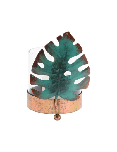 Ce jolie bougeoir est en verre de forme cylindrique, et orné d'une jolie feuille de couleur verte patinée cuivrée pour apporter une touche de couleur. Embellissez et apportez une ambiance chaleureuse à votre intérieur avec ce joli photophore.