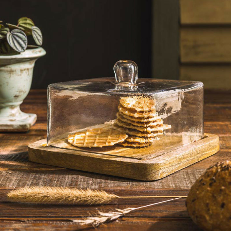 Design Atteignant : Le contraste entre la base organique en bois et la transparence cristalline de la cloche crée une mise en scène immédiate pour vos produits.
