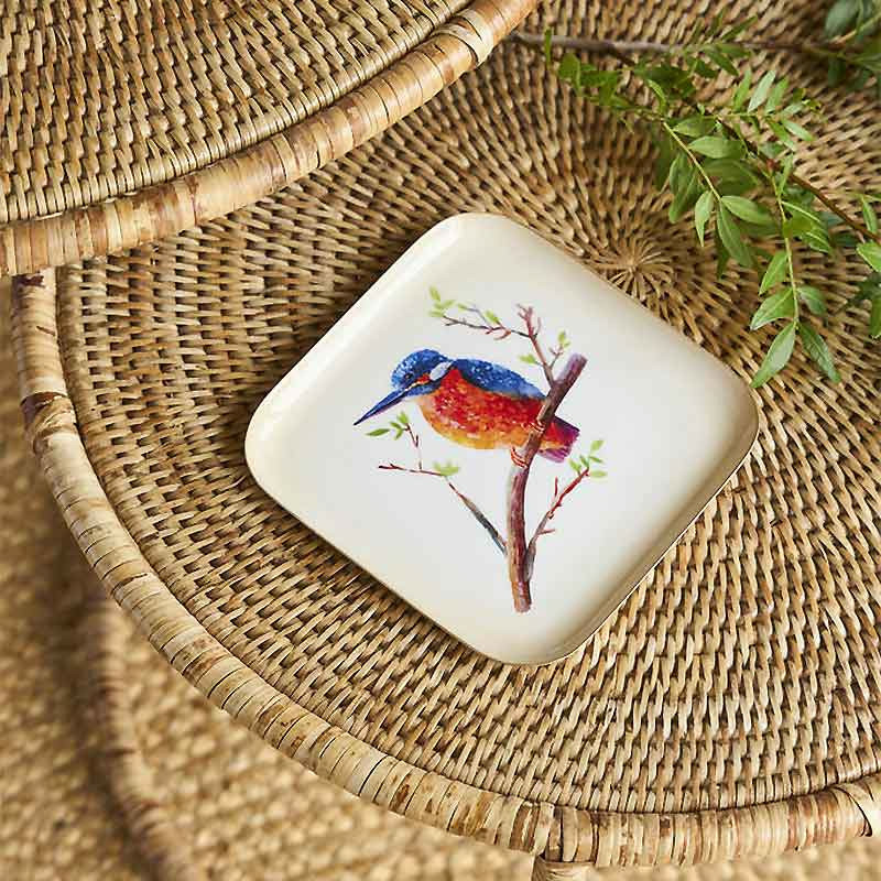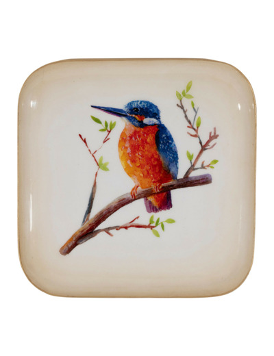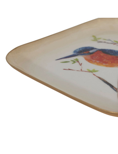 Dans une vitrine aux côtés d’objets précieux, le plateau décoratif oiseau rouge bleu attire immédiatement le regard et ajoute une note chic et lumineuse.