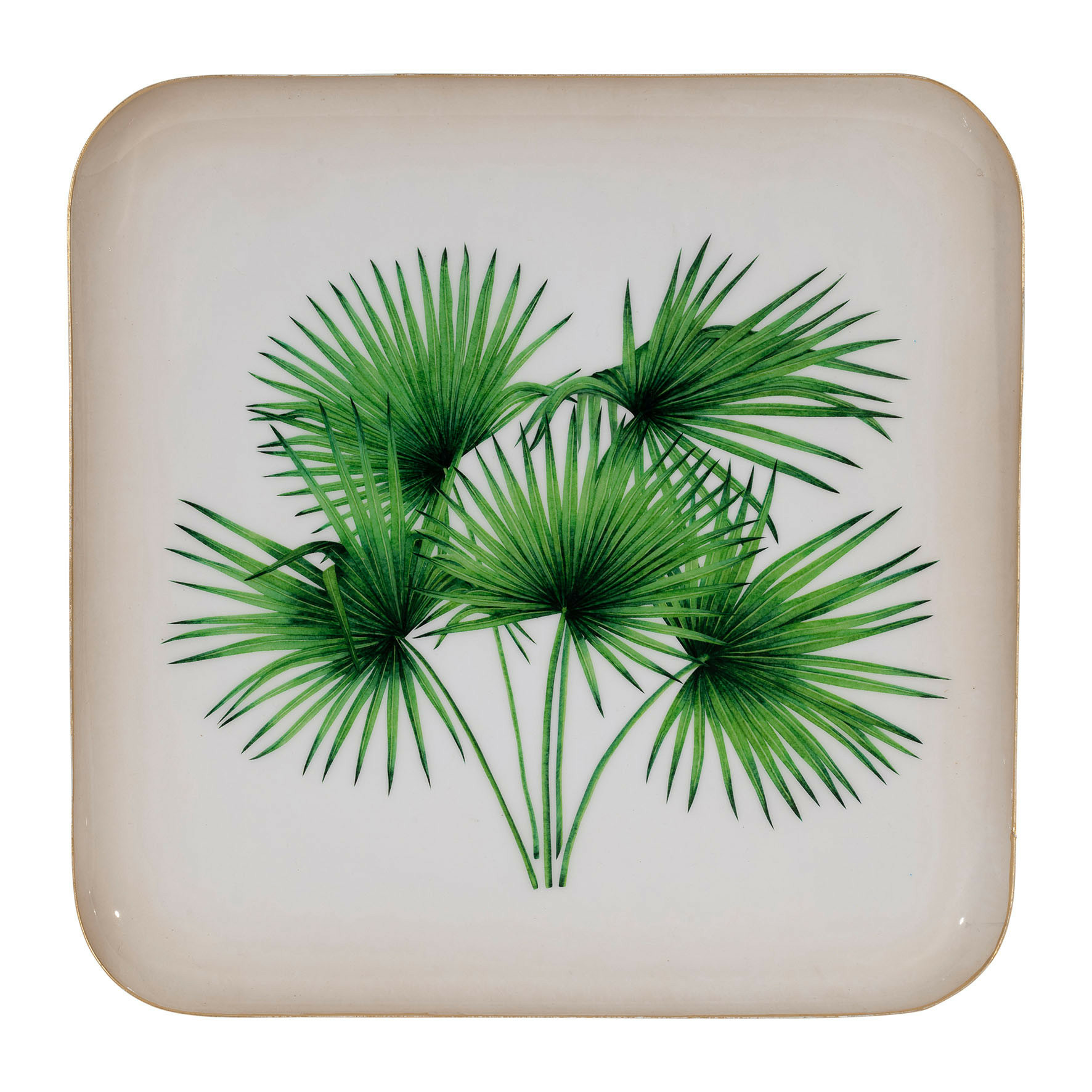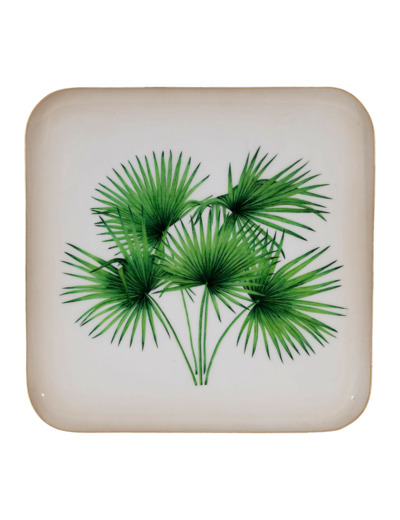 Le plateau palmier vert métal trouve parfaitement sa place dans un salon, posé sur une table basse en bois naturel ou en rotin.