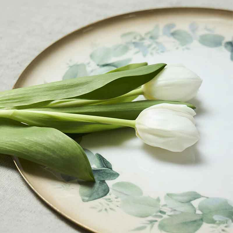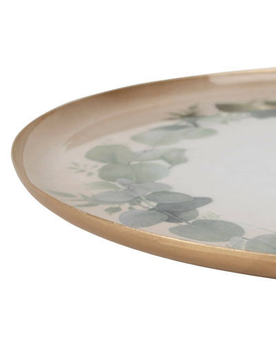 Le plateau rond eucalyptus vert métal trouve naturellement sa place sur une table basse, accompagné d’un vase en céramique et de bougies parfumées pour une ambiance douce et végétale.