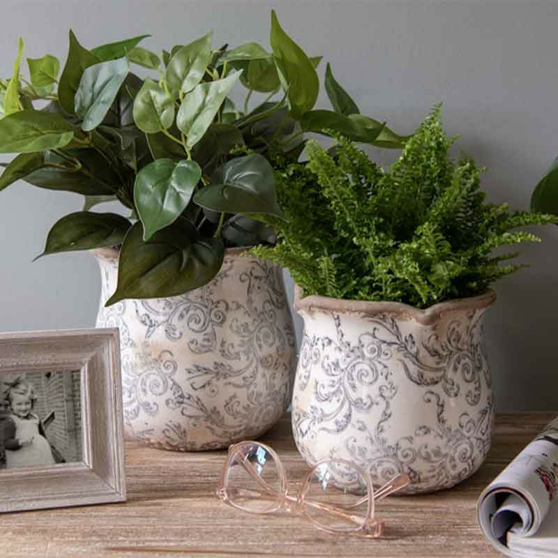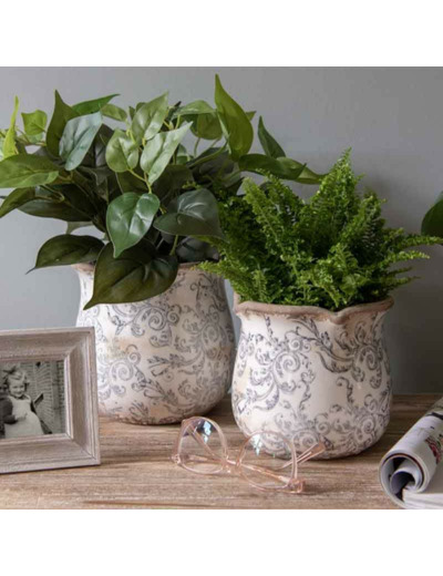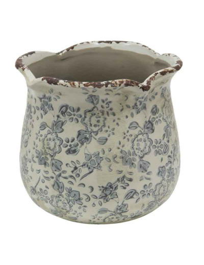 Le pot céramique motif floral trouve parfaitement sa place sur une console en bois brut, où son charme vintage et son motif floral délicat viennent sublimer une décoration champêtre ou romantique.