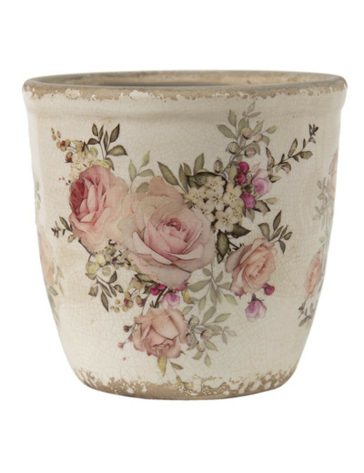 Dans un salon au style shabby chic ou romantique, le pot de fleur en céramique se place idéalement sur une table basse, un buffet ou une bibliothèque, mis en valeur avec une guirlande lumineuse, des livres anciens et une lampe en laiton.