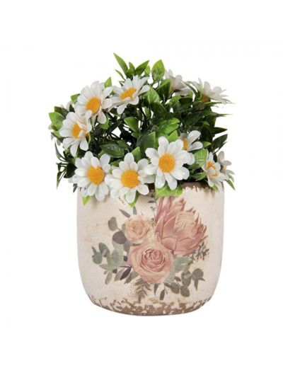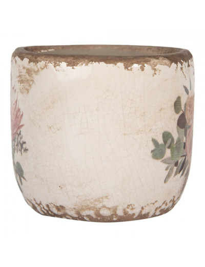 Ce petit pot de fleurs est caractérisé par sa forme compacte et élégante. Le motif floral, une impression de roses et de feuillages dans des tons pastel et vert sauge, se détache joliment sur le fond beige. Sa petite taille en fait un objet extrêmement polyvalent qui s'intègre facilement dans tous les espaces, même les plus restreints. Il est idéal pour l'intérieur !