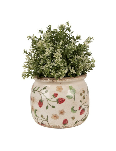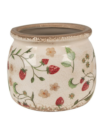 Ce charmant pot en céramique est une pièce charmante et pleine de caractère, dont l'aspect vieilli et les motifs de fraises en font un ajout délicieux à tout espace cherchant à cultiver une ambiance douce, naturelle et authentique.