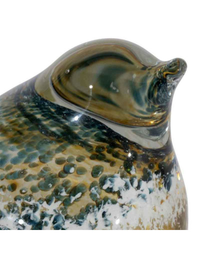 Sur une table basse moderne, le presse-papier oiseau verre jaune vert gris devient un élément décoratif captivant, sublimant l’espace avec harmonie et subtilité.