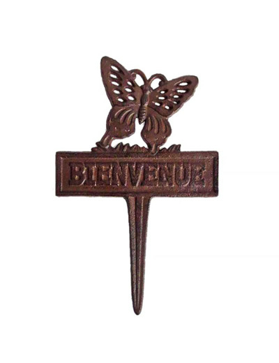 Créez un coin accueillant et plein de caractère avec ce duo de piquets en fonte au message "Bienvenue". Leur design travaillé, l'un surmonté d'un papillon et l'autre d'un tournesol en fait de véritables éléments décoratifs à planter où bon vous semble : à l'entrée d'une allée, dans un bac fleuri sur une terrasse ou près d'un banc au fond du jardin.