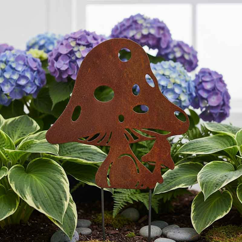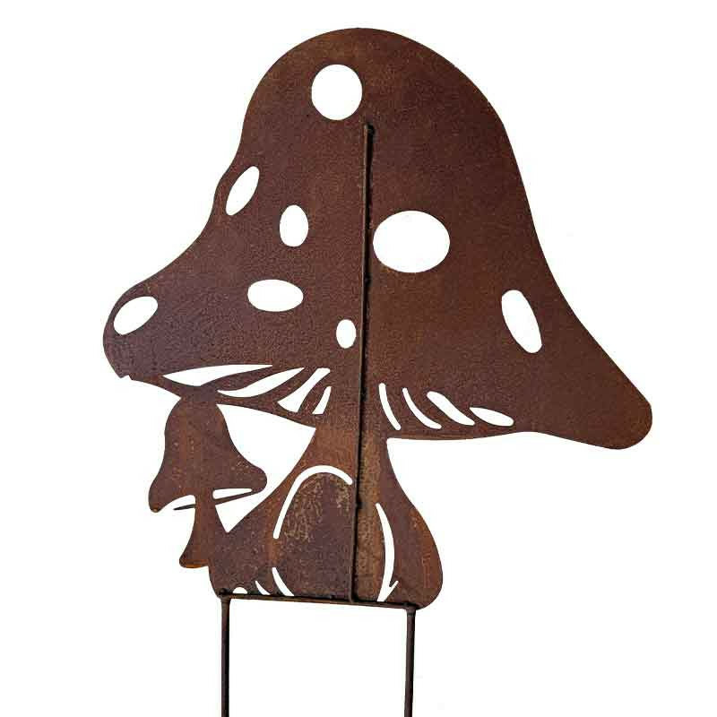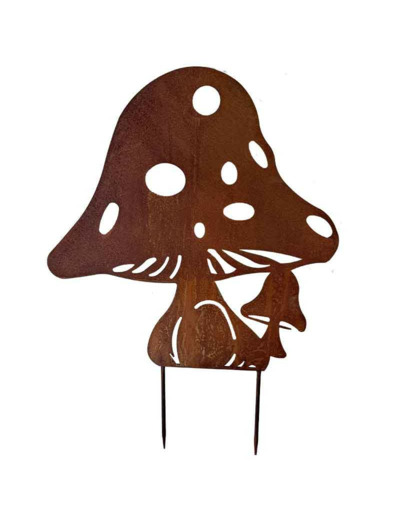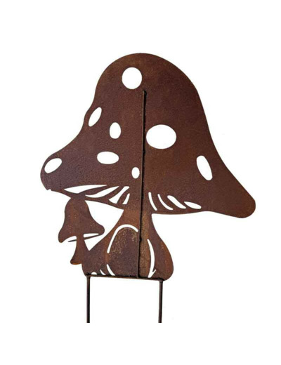 Très jolie silhouette de jardin à planter en fer de couleur rouille, apportez de la décoration grâce à ce grand champignon et égayez votre jardin.