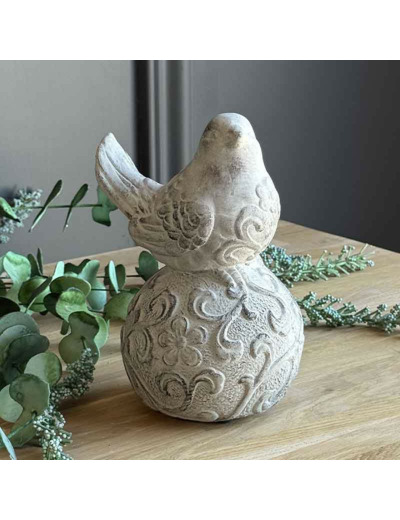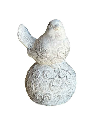 Apportez du caractère à votre décoration avec "Le chant de l’oiseau", une statuette en ciment qui allie la robustesse du matériau à la finesse du détail. Cette pièce représente un oiseau sobrement sculpté, posé sur une sphère décorée de motifs floraux en relief, pour un rendu à la fois naturel et décoratif.