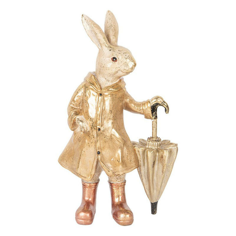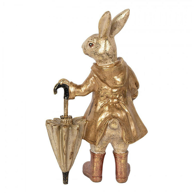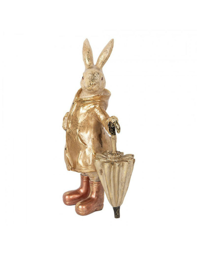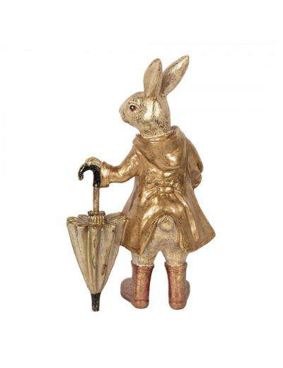 Cette figurine de lapin est une pièce décorative originale. Le lapin est représenté debout, dans une pose élégante, vêtu d'un manteau de pluie et tenant un parapluie fermé. La matière utilisée permet une grande finesse dans les détails de la statuette. La couleur beige patinée avec un effet métallisé doré sur le ciré confère à la statuette une allure sophistiquée et vintage.