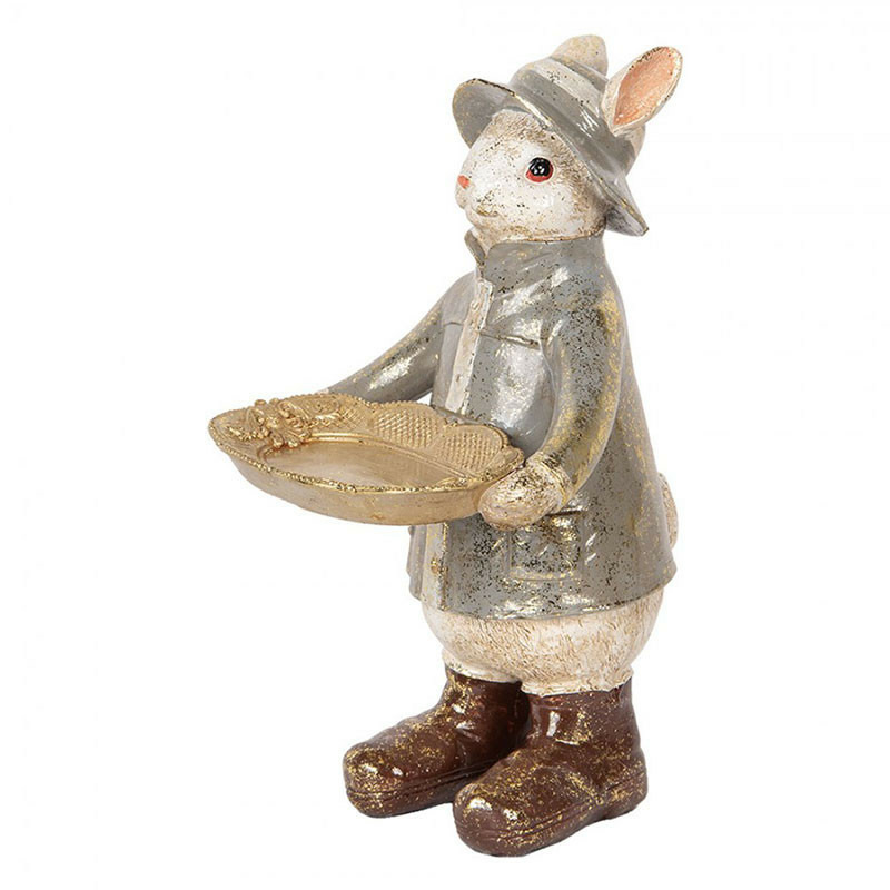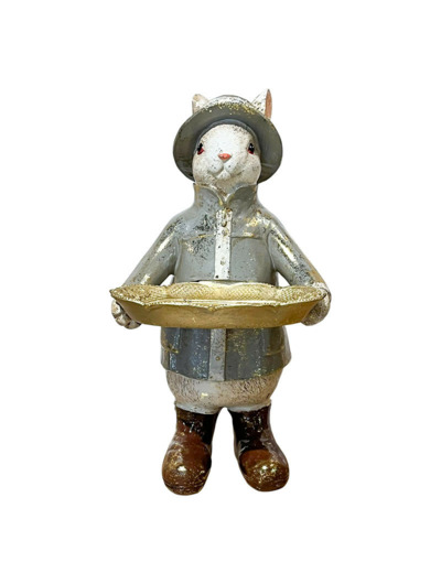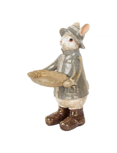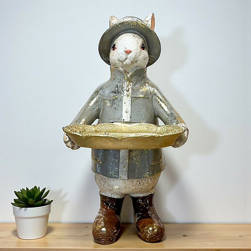 Voici une figurine décorative pleine de fantaisie : un lapin humanisé tenant un plateau doré dans ses pattes.