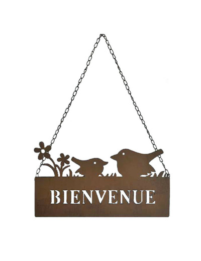 Décorée de petits oiseaux, du mot "Bienvenue", et de fleurs, cette ravissante suspension murale accueillera chaleureusement vos convives.