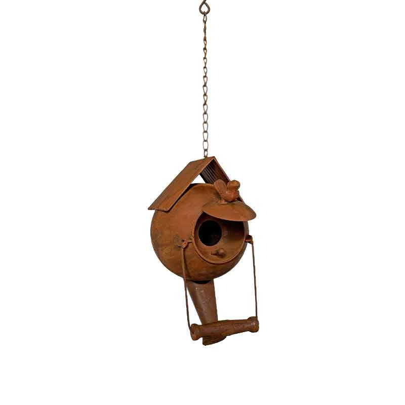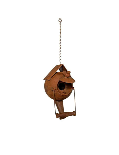 Fabriquée en fer patiné, elle se distingue par son toit en tôle ondulée, clin d’œil au charme des fermes d’antan, et ses perches suspendues qui offrent un repos idéal aux oiseaux. Un petit oiseau sculpté posé sur la poignée apporte une note de tendresse et de réalisme.