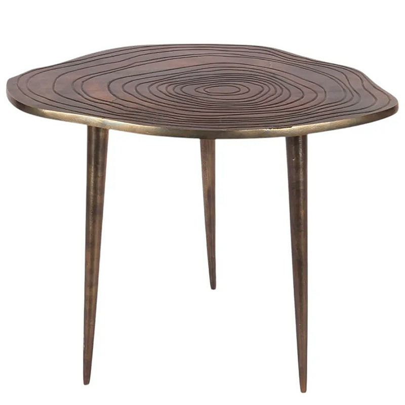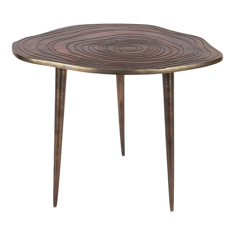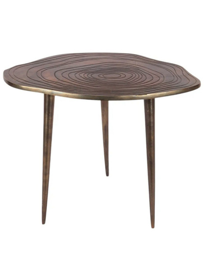 Cette table d'appoint en aluminium, avec son plateau inspiré d'une coupe de tronc d'arbre et sa riche patine effet bronze, est extrêmement versatile.