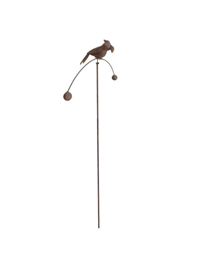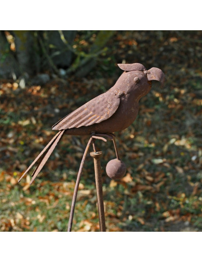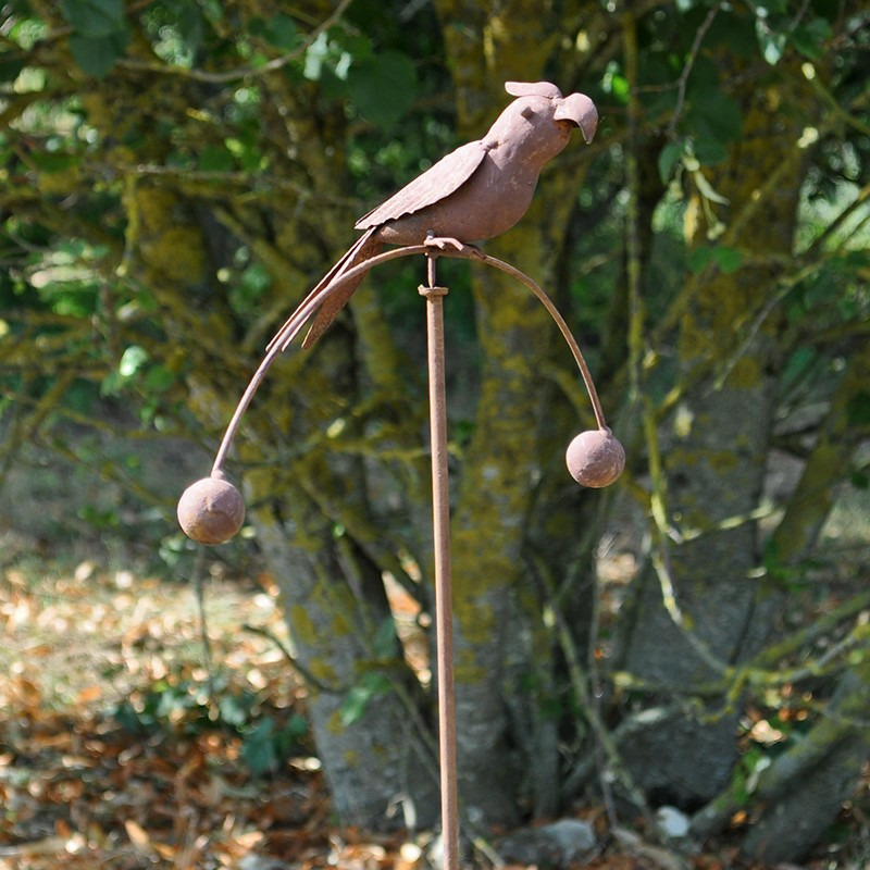 Superbe perruche en métal patiné rouille, sur tige. Ce volatile repose sur une tige, équilibré par deux poids. Au gré du vent, cet oiseau prendra vie dans votre jardin. Idéal comme idée cadeau !