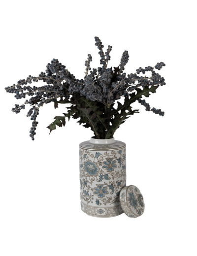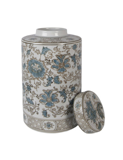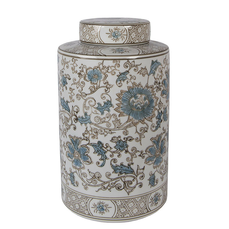 Motifs Floraux Raffinés : Le corps du pot est orné de fleurs épanouies et de volutes végétales dans des tons de bleu azur et des touches de beige/bronze, offrant une profondeur visuelle exceptionnelle.