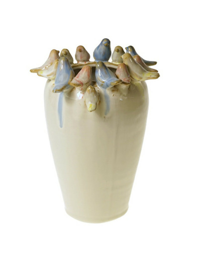 Ce vase poétique en grès, avec sa frise d'oiseaux aux couleurs pastel, mérite un emplacement qui célèbre son design unique.
