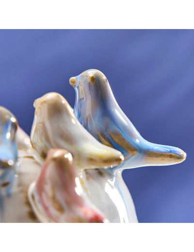 Grâce à son émail blanc brillant, le vase se marie parfaitement avec les matériaux naturels : posez-le sur une surface en bois brut pour un contraste chaleureux, ou devant un mur de couleur sombre pour que les teintes pastel des oiseaux ressortent avec éclat.