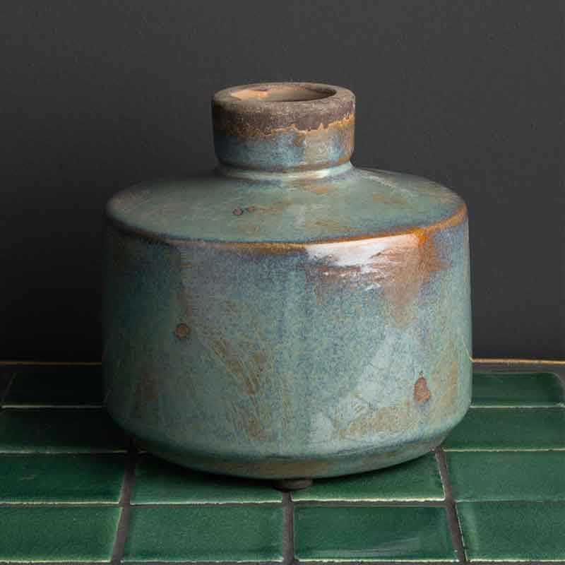 Ce vase est parfait pour être exposé seul sur une commode basse ou un buffet en bois brut ou foncé, où son émail complexe sera mis en valeur.