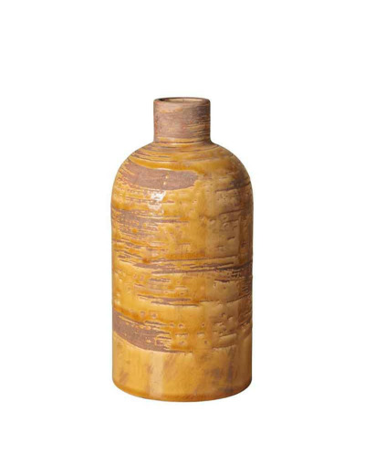 Ce vase décoratif de 22 cm de hauteur présente une silhouette élancée de bouteille, avec un col étroit et un corps cylindrique.