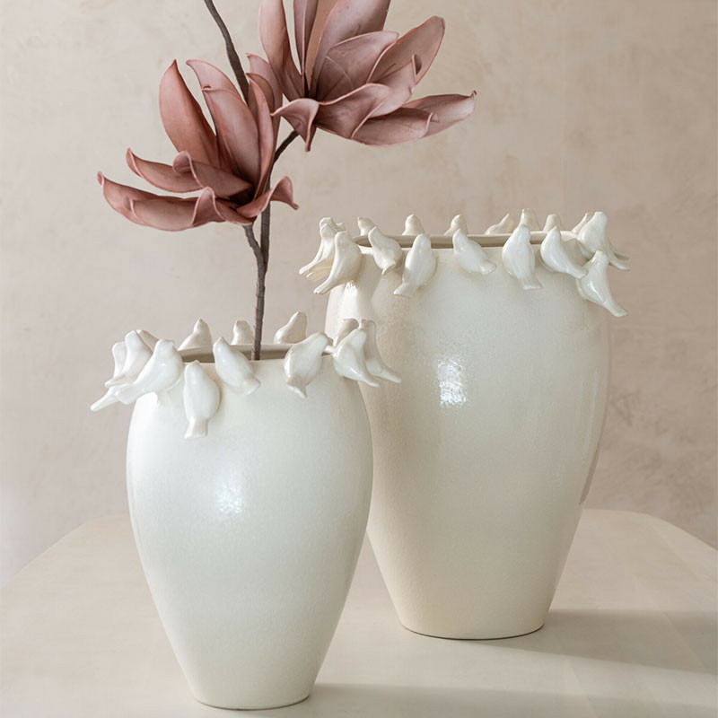 Utilisez ce vase pour des arrangements de fleurs longues et fines ou de branches séchées, permettant à la couronne d'oiseaux de rester bien visible et d'interagir avec votre composition florale.