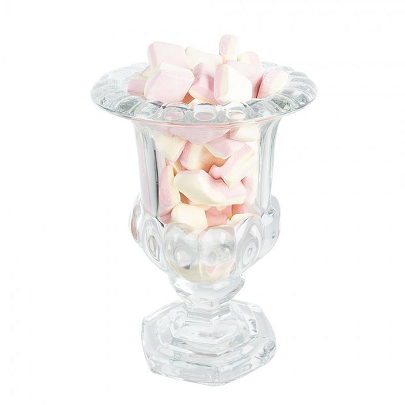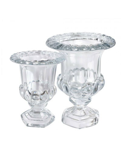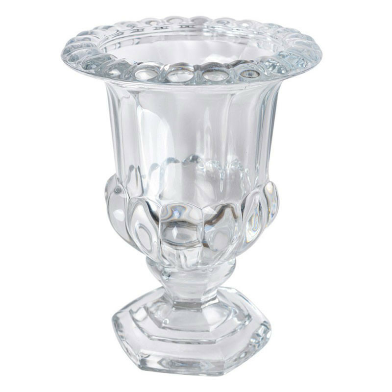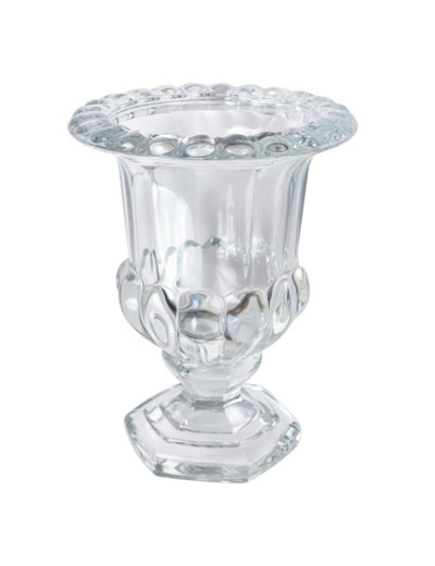 Ce petit vase, reprenant le même style travaillé que le grand modèle, est plus adapté aux surfaces réduites. Le verre moulé présente des motifs géométriques et floraux en relief sur le corps et le pied hexagonal, créant un contraste entre transparence et texture. C'est une présence joyeuse dans la maison et un élément décoratif très distinctif.