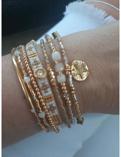 Cette magnifique manchette se compose d’1 lien de 20mm tissé à la main s& de 2 de 11mm: Des perles gold mat, du fil de soie,un lien tréssé de soie doré, gold doré 24k, crystal , cœur et nacre veritable, perle d’eau douce, croix en plaqué or…etc.