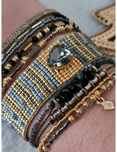 Cette magnifique manchette se compose d’1 lien de 20mm tissé à la main serti d’un cœur en crystal & de 2 de 11mm: Des perles noir, gold doré 24k, crystal , chips en agate noir, quartz fumé