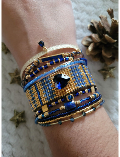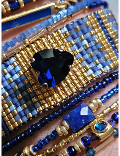 Cette magnifique manchette se compose d’1 lien de 20mm tissé à la main serti d’un cœur en crystal bleu & de 2 de 11mm: Des perles bleu roy, gold doré 24k, crystal , Lapis lazuli,