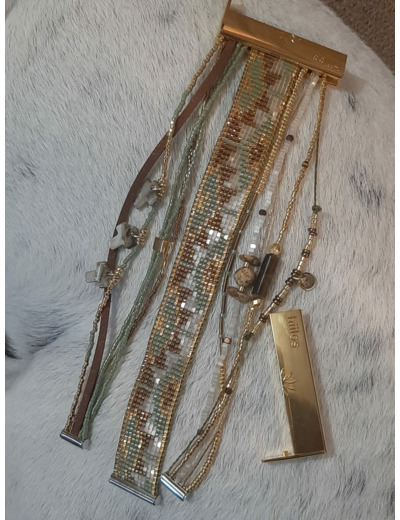 Un tissage de perles de verre , fil de soie et de son fermoir aimanté interchangeable Hiilos finition doré or 45 mm.