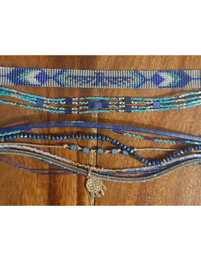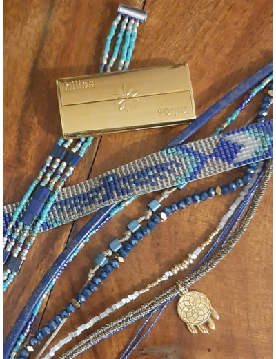 Cette magnifique manchette se compose de 3 liens (2 de 11mm) (1 de 20mm): Des perles de verres de bleues , perles tila ,