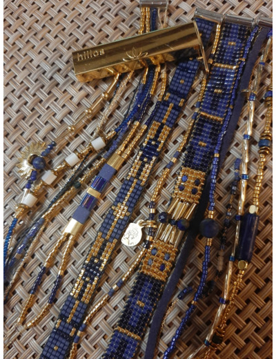 Cette magnifique manchette se compose de 4 liens de 11mm: Des perles en Lapis Lazuli, Hématite doré, perles de verre, en plaqué Or, breloque pièce et soleil en plaqué or… & pampille en plaqué et Lapis Lazuli…