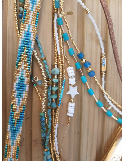 Cette magnifique manchette se compose de 4 liens de 11mm: Des perles Africaine, de l’Amazonite, des apatites bleu, Hématite doré, nacre, perles, breloque en plaqué or… & pampille en amazonite