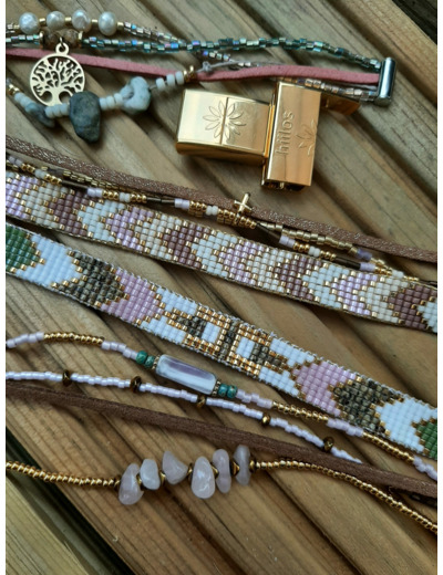 D’un tissage de perles de verre et de son fermoir aimanté interchangeable Hiilos fiition doré or de 22 mm.