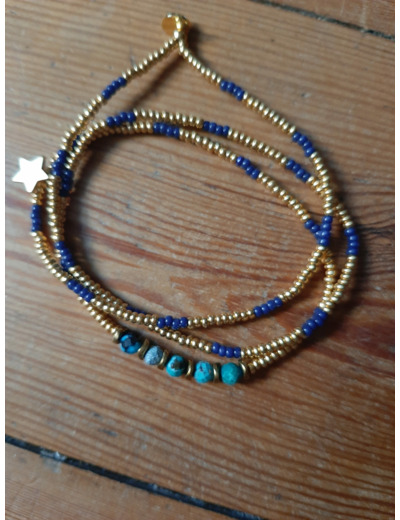 Multitude de perles rocaille doré en plaqué Or 24k, perles miyuki blue navy et ses perles cylindrique facetté doré à l'or fin et ses perles de Turquoise Africaine et Hématite doré triangle. Une pampille étoile doré à l'or fin.