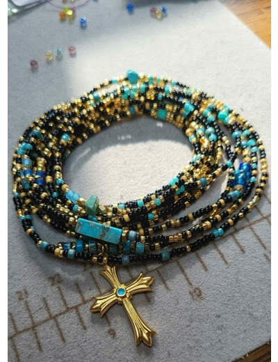 Pendentif Croix doré à l’or fin , perles de TURQUOISE, Hématites , perles gold doré 24K….