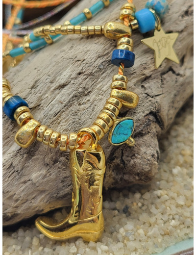 Perles Miyuki rocaille Doré et pendentif Santiag doré à l’or fin, breloque oeil avec Turquoise véritable; ses pierres naturelle (Jaspe imperial, , hematite, Turquoise)