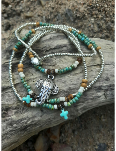 Sa breloque Tête d’Éléphant en argent vieille (22mm)et Croix en email turquoise.